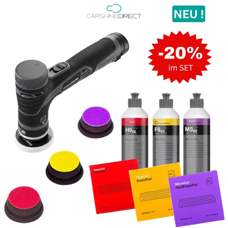 In diesem Polierset erhält Ihr moderne ChemicalWorkz Akku Hybrid-Exzenter Poliermaschine EVO Mini PRO mit 3 Polituren von Koch Chemie und 6 passenden Pads - in 2 Größen - von Koch Chemie dazu.