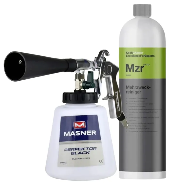 Dieses Innenreinigungs-Set kombiniert die leistungsstarke Masner Perfektor Black Druckluft-Reinigungspistole mit dem kraftvollen Koch Chemie MZR Mehrzweckreiniger. Damit lassen sich Fahrzeuginnenräume schnell, gründlich und effizient reinigen – auch in Ritzen, Nähten und strukturierten Oberflächen.