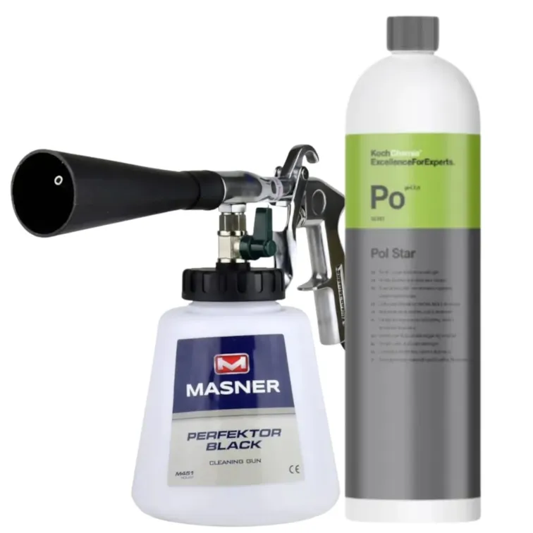 Dieses Innenreinigungs-Set kombiniert die Masner Perfektor Black Druckluft-Reinigungspistole mit dem materialschonenden Koch Chemie Pol Star Reiniger. Es ermöglicht eine gründliche und gleichzeitig schonende Reinigung von Fahrzeuginnenräumen, insbesondere empfindlicher Materialien.